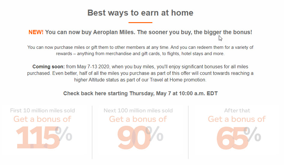 - Aeroplan Travel at Home: Are you signed up for Aeroplan’s “Travel at Home” promotion to accelerate the achievement of Air Canada Altitude Elite Status? If so, half of the miles you purchase will count towards status. This adds further incentive to purchase miles for those participating in this promotion.