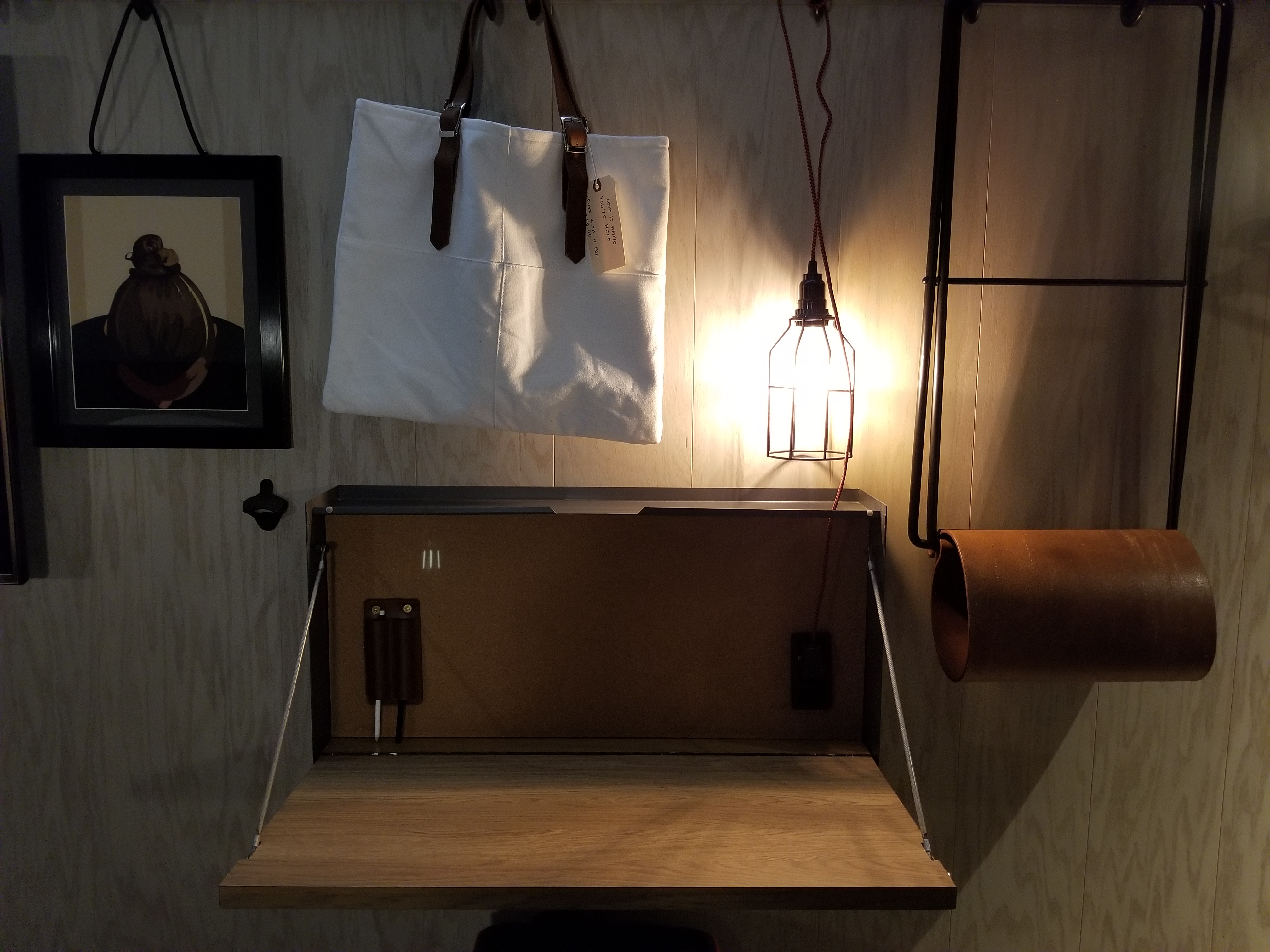 There is a small desk that folds into the wall when not in use and a small stool to sit on. You could probable sit here and use it to work if you have a small laptop but I don’t think it would be comfortable. I’d suggest going to the bar where you can find a place to sit with a coffee or a drink.