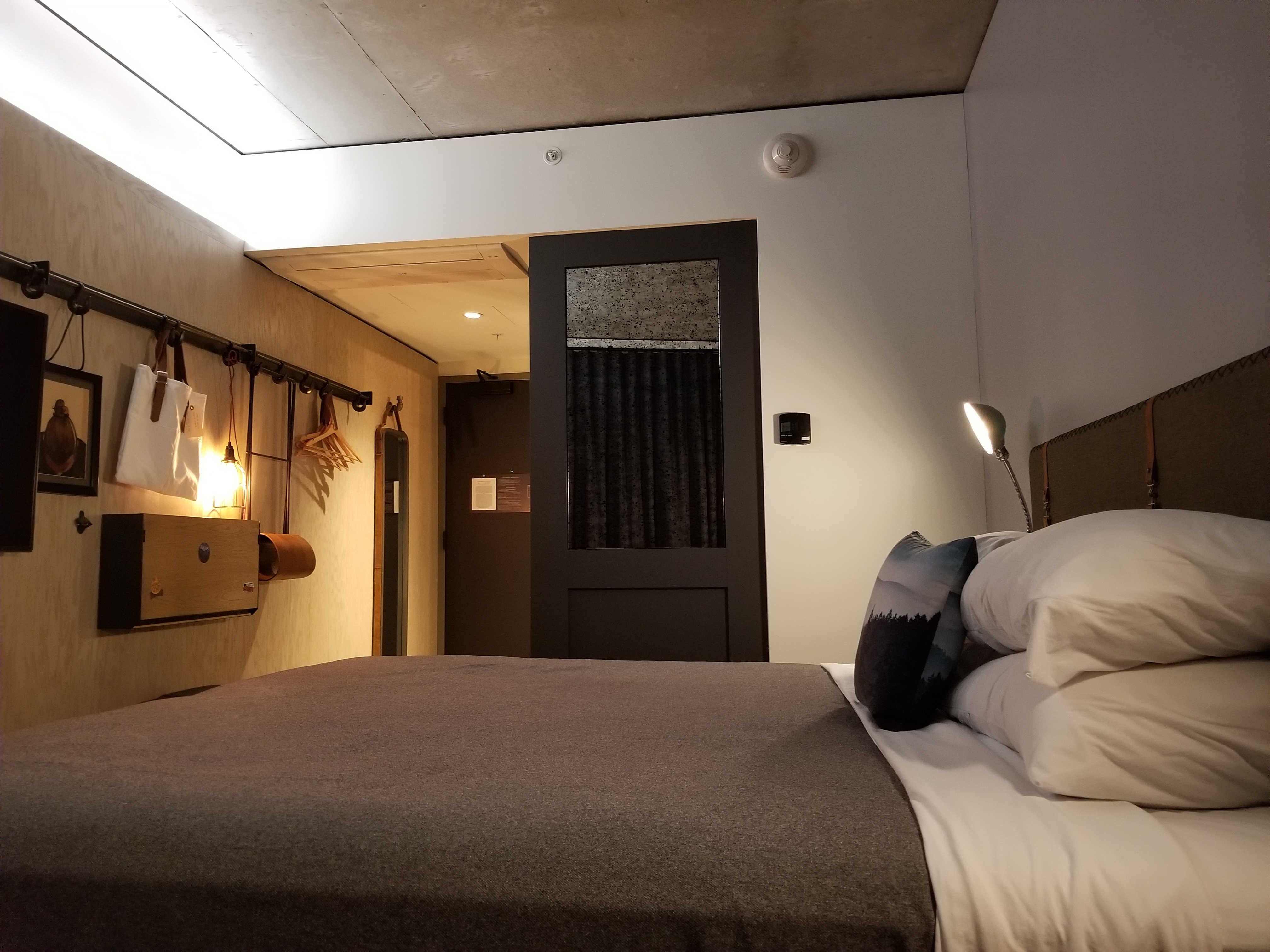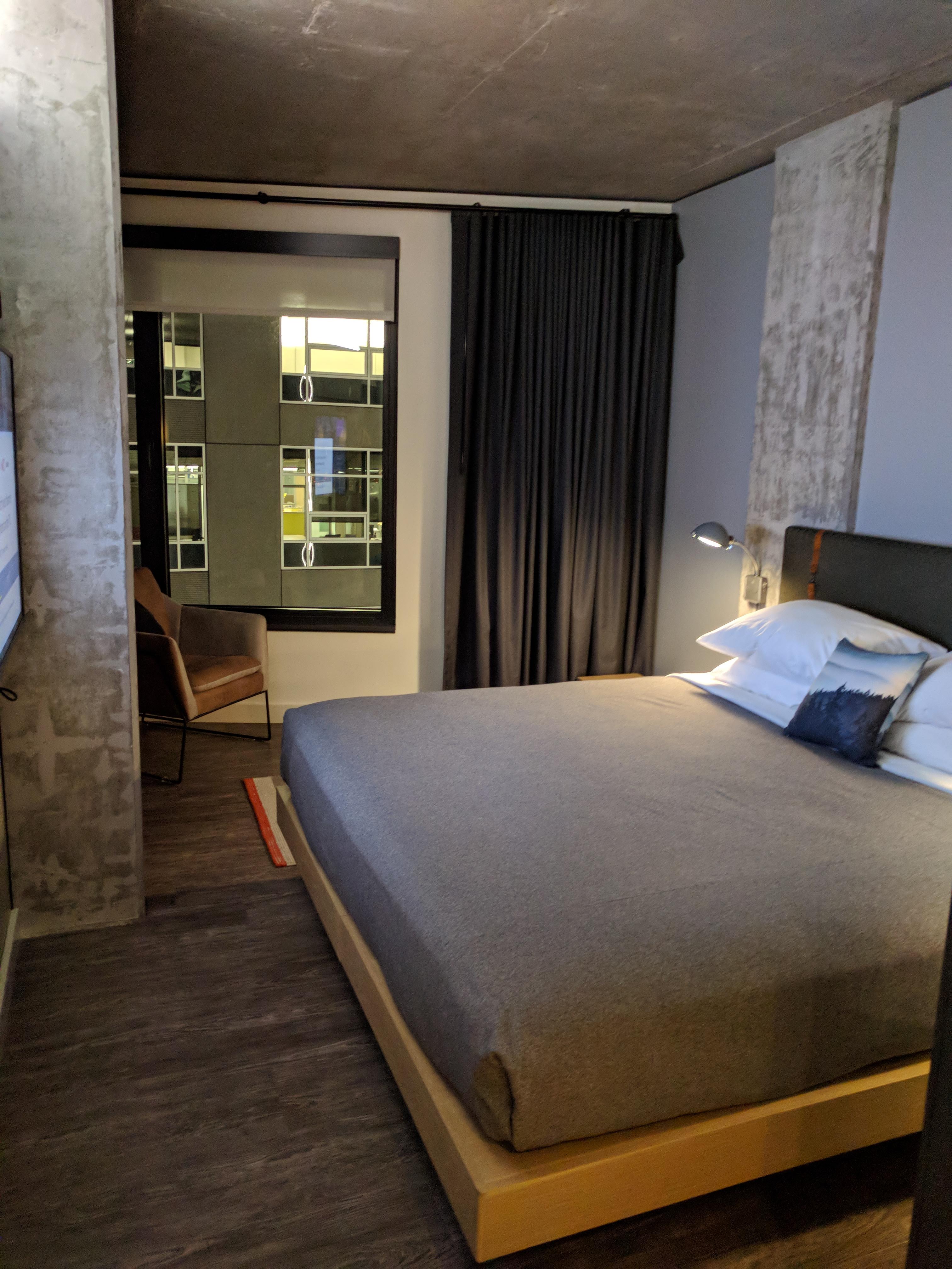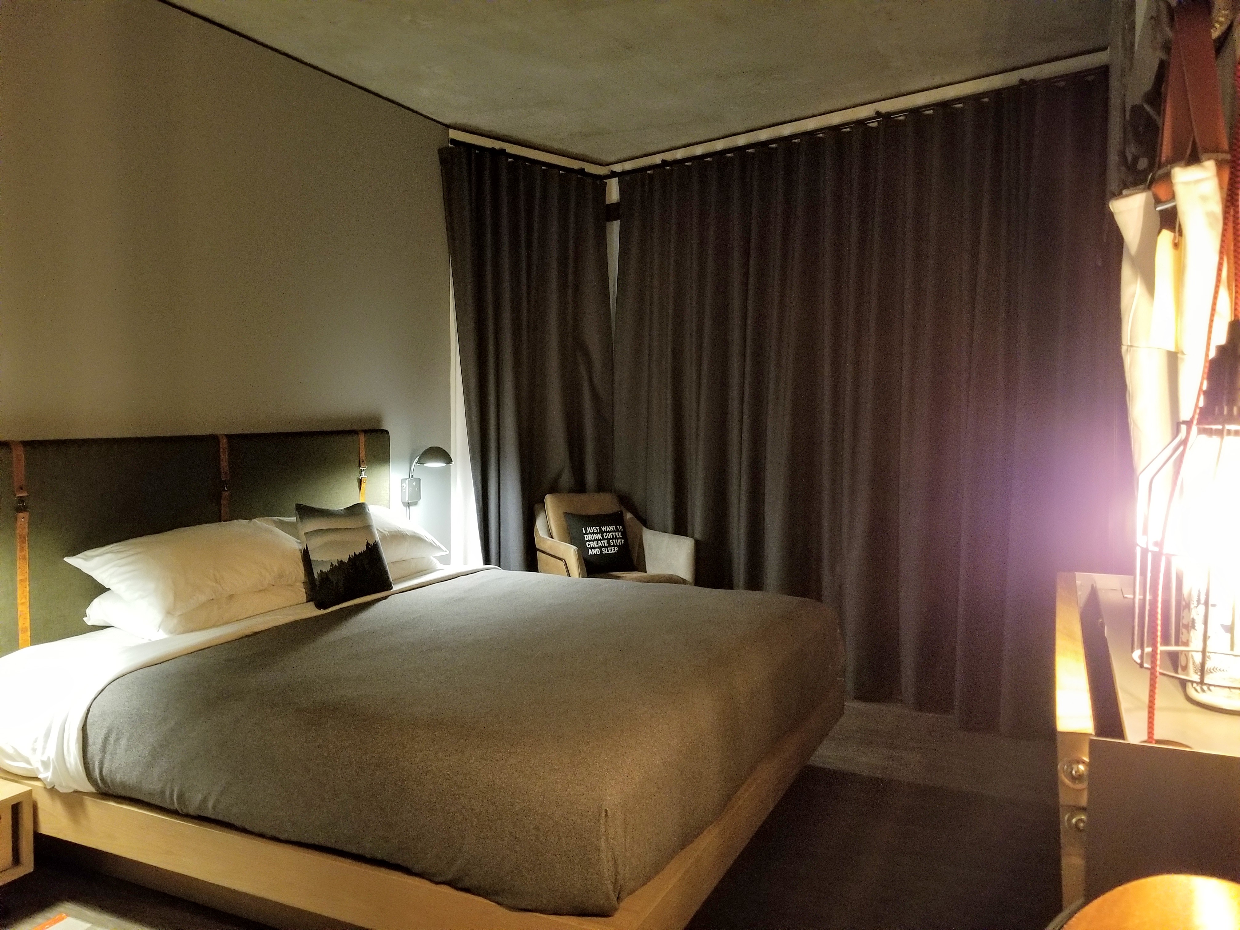 As I entered the room, I was pleased by the overall look of the room and design, especially the bathroom that had a nice rain forest shower head and white tile. The industrial lighting was nice too and went well with the concrete accents and the dark grey wood floors. The small chair in the corner with the side table made of a log of wood was also nice and comfortable and I enjoyed reading there.