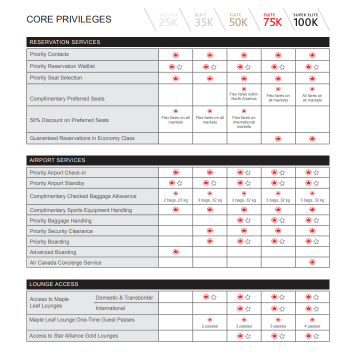 Air Canada 2019 Core Privileges Chart
