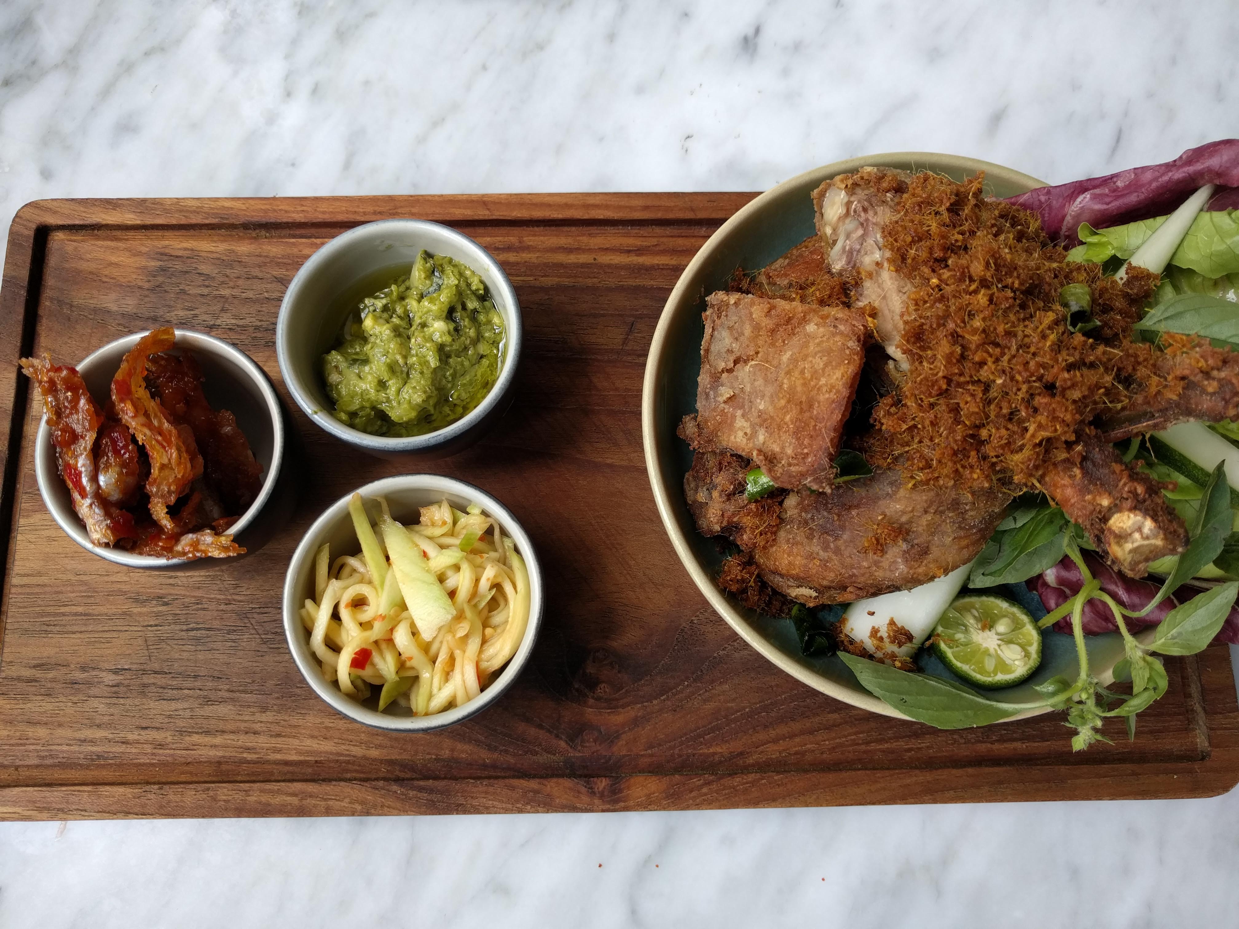 - Bebek goreng with sambal mango sambal hijau ikan asin manis & lemon basil