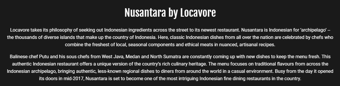 Nusantara means “Archipelago” and is one of a few restaurants operated by the Locavore group.