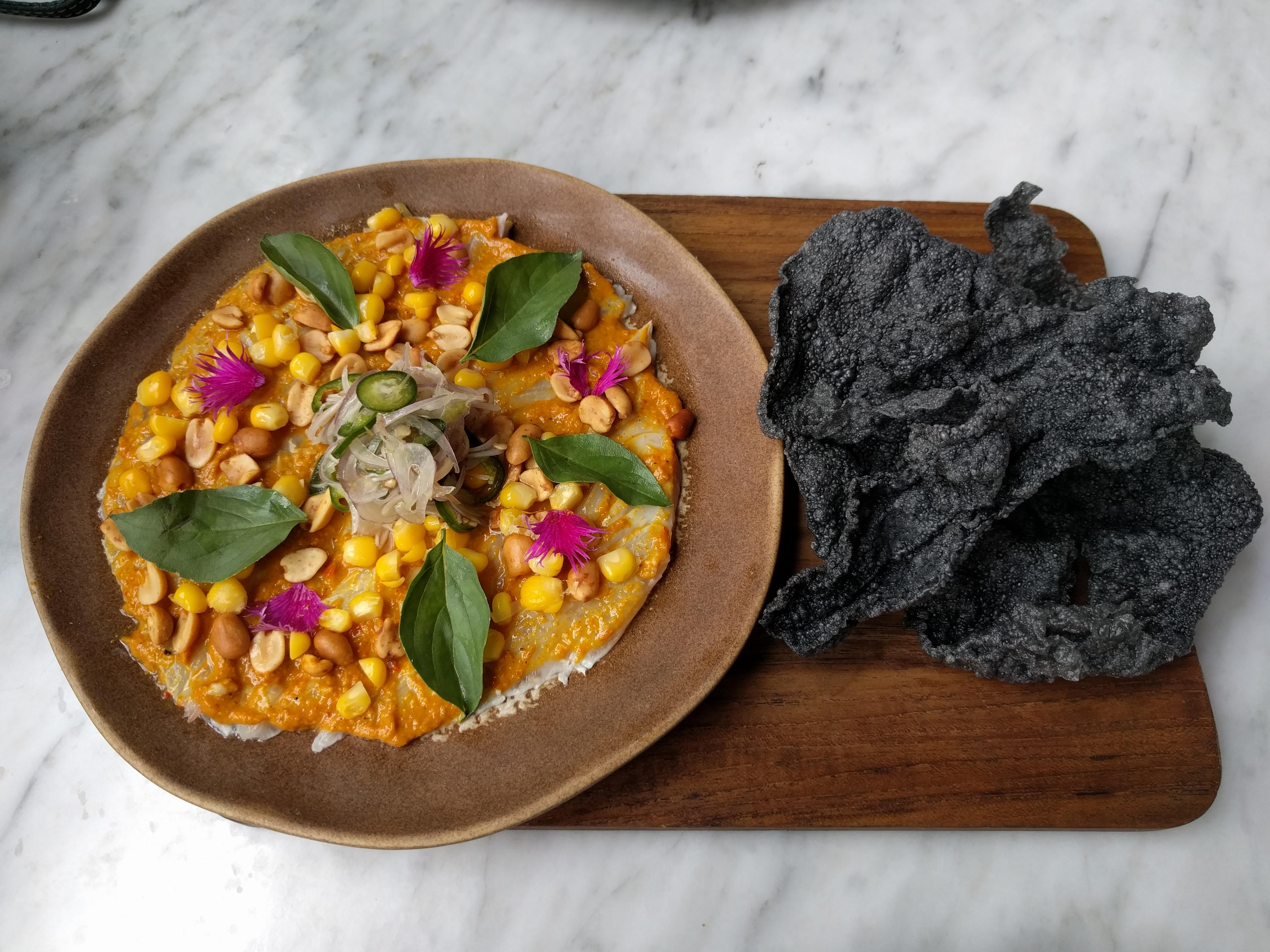 - Lake Toba snapper ceviche marinated in kair lime juice andaliman peanut chili ginger flowers and served with krupuk peyek