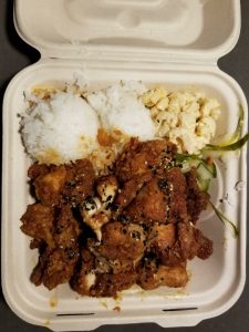Chili chicken plate with 2 scoops of rice, macaroni salad, and pickles at Saimin Dojo