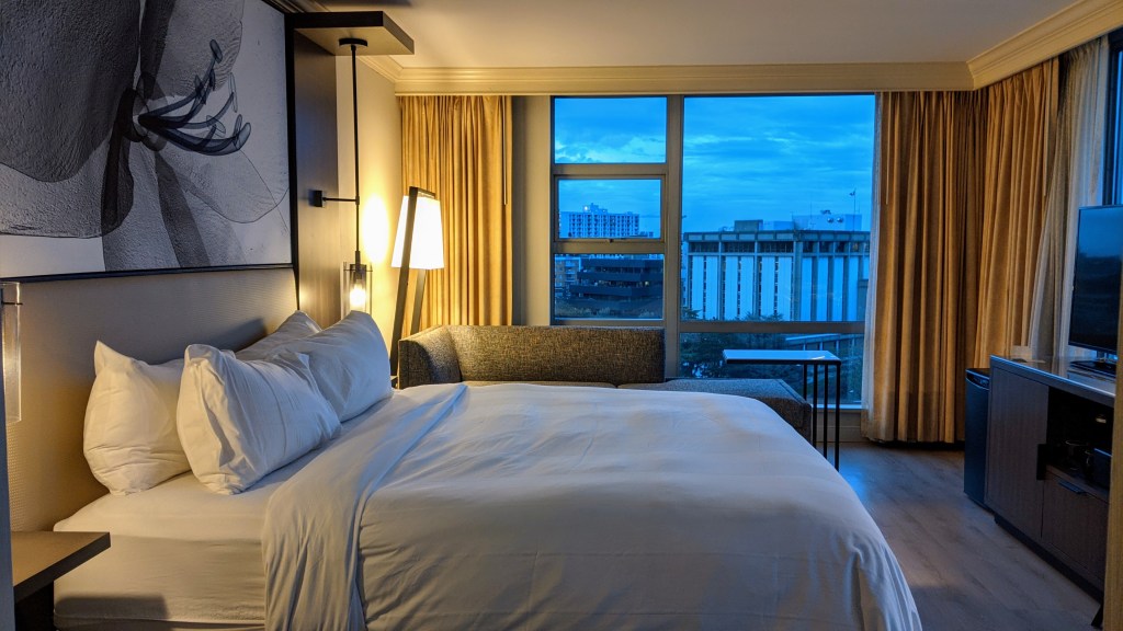 - Victoria Marriott Inner Harbour: This hotel has an excellent location in downtown Victoria and semi renovated rooms. It has a small fitness center and pool, onsite dining, and an M Lounge where eligible Marriott members can get breakfast and snacks. You can find out more about this hotel in our review posted on the blog: “Marriott Victoria Inner Harbour: Downtown Hotel with Close Harbor Access“.