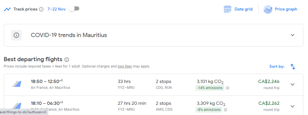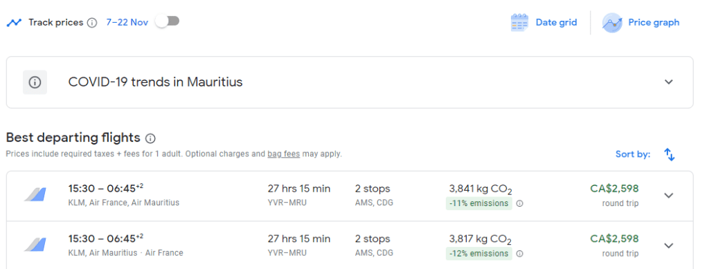 For example, you can fly from YVR – Vancouver to MRU – Sir Seewoosagur Ramgoolam International Airport (in Mauritius) for $2,600CAD return flying with KLM to Amsterdam, Air France to Paris and then Air Mauritius from Paris to Mauritius.