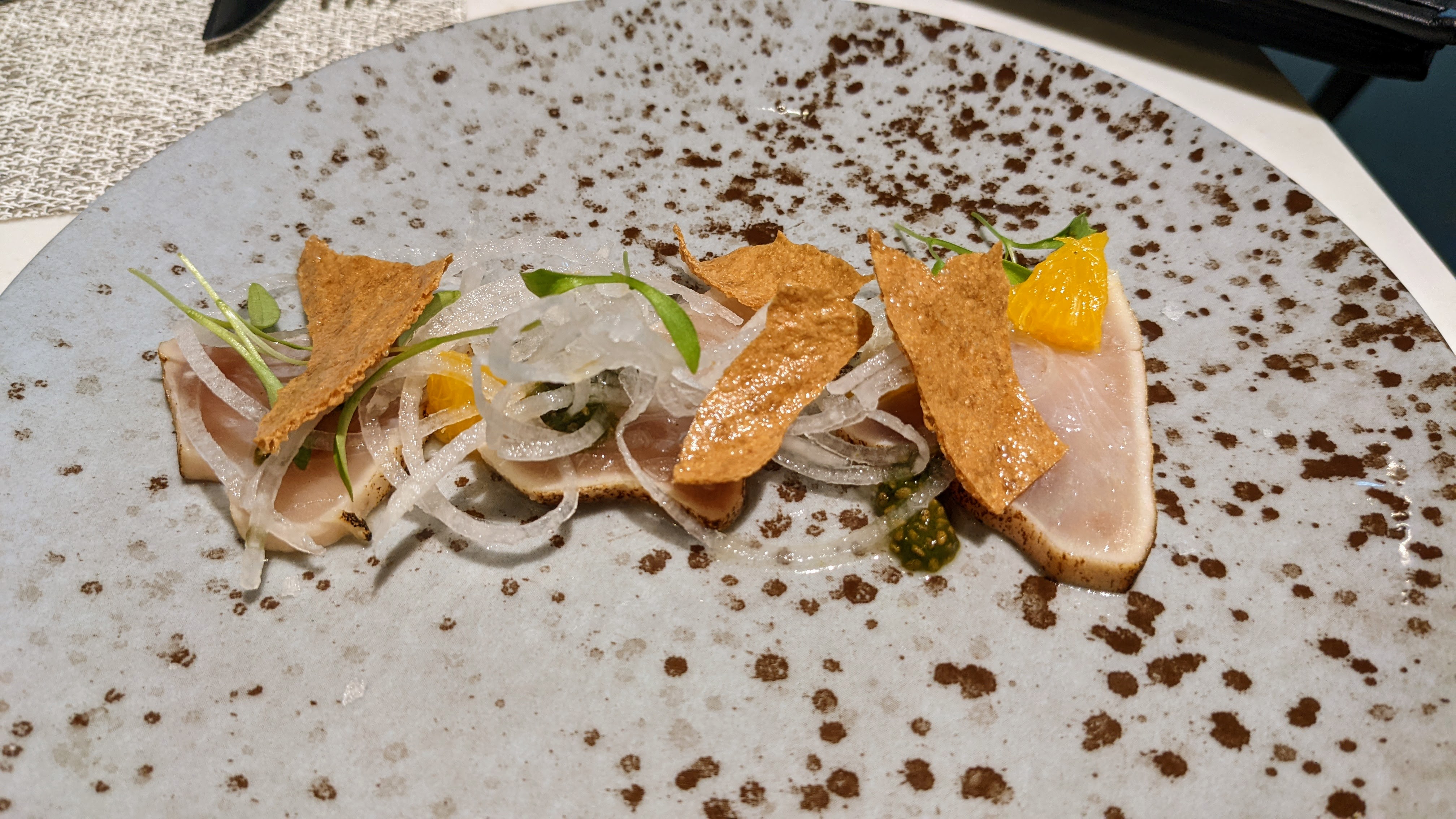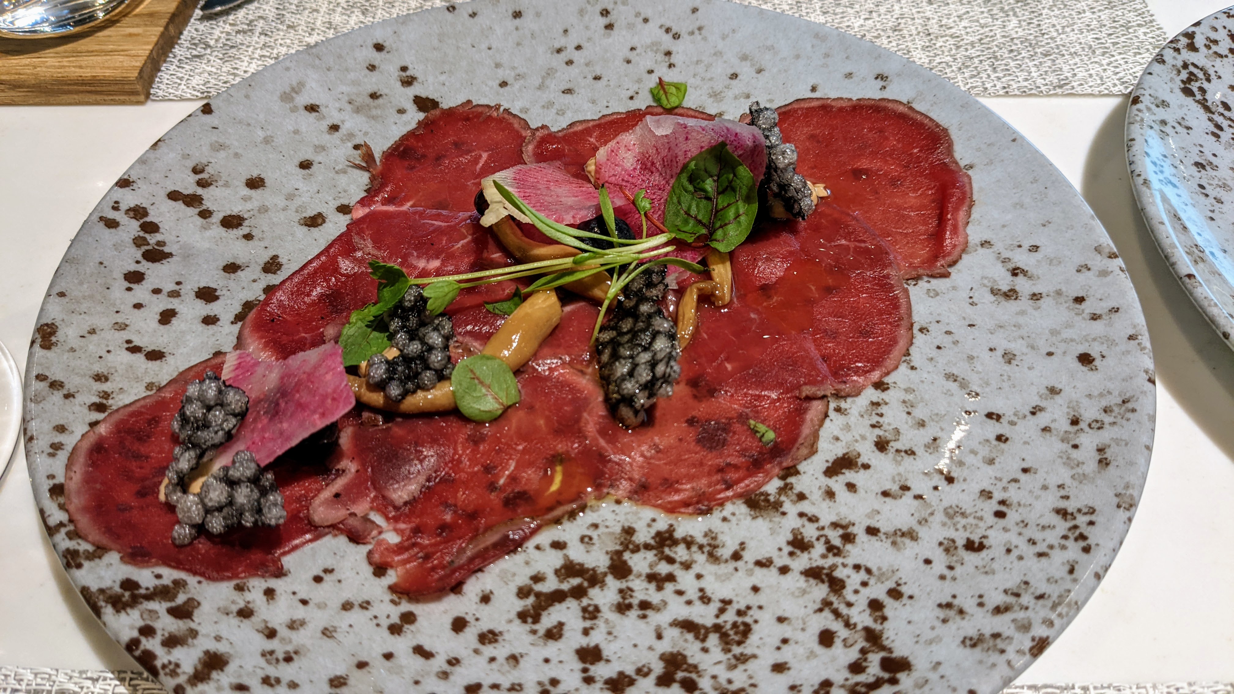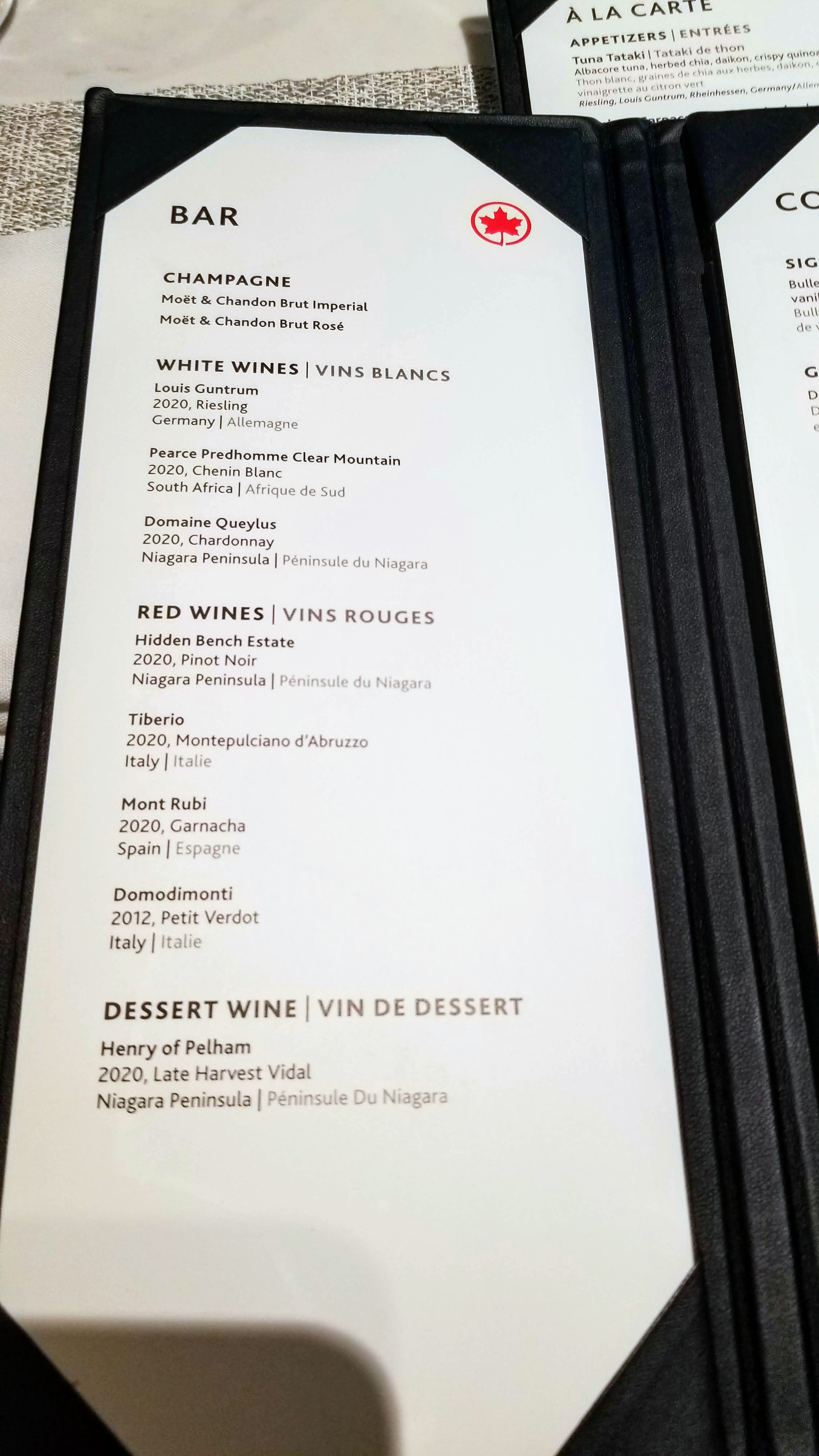 Upon return, they found space for us in the dining area. It was a tight squeeze due to the proximity of other tables and people. Once seated, we were brought a menu for food and drinks and eventually an amuse-bouche. It was hard to feel comfortable because of the proximity to your neighbours but eventually, everyone just became friends and started conversing with one another. Everyone was happy to be traveling again and wanted to share their experiences with one another!