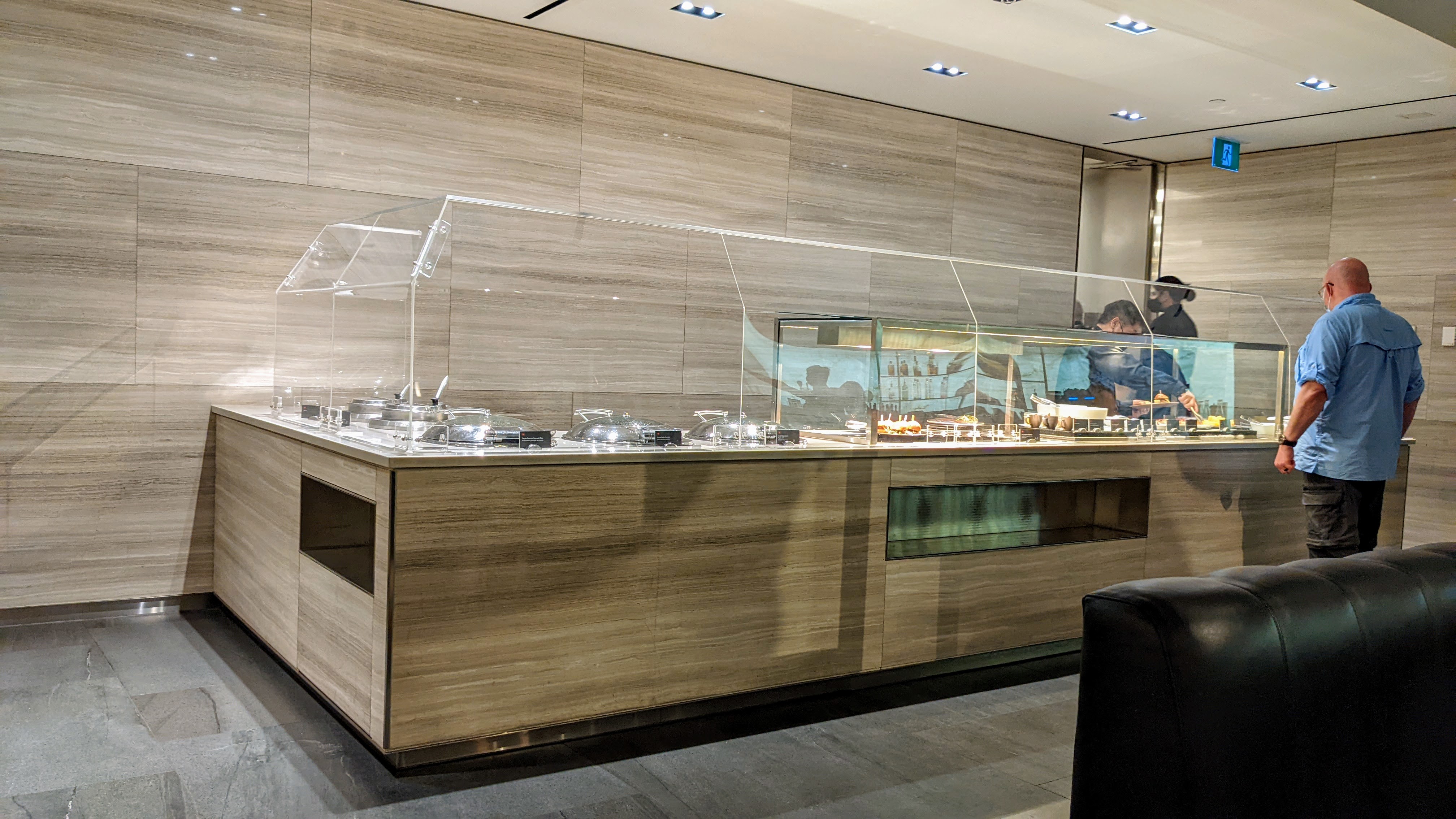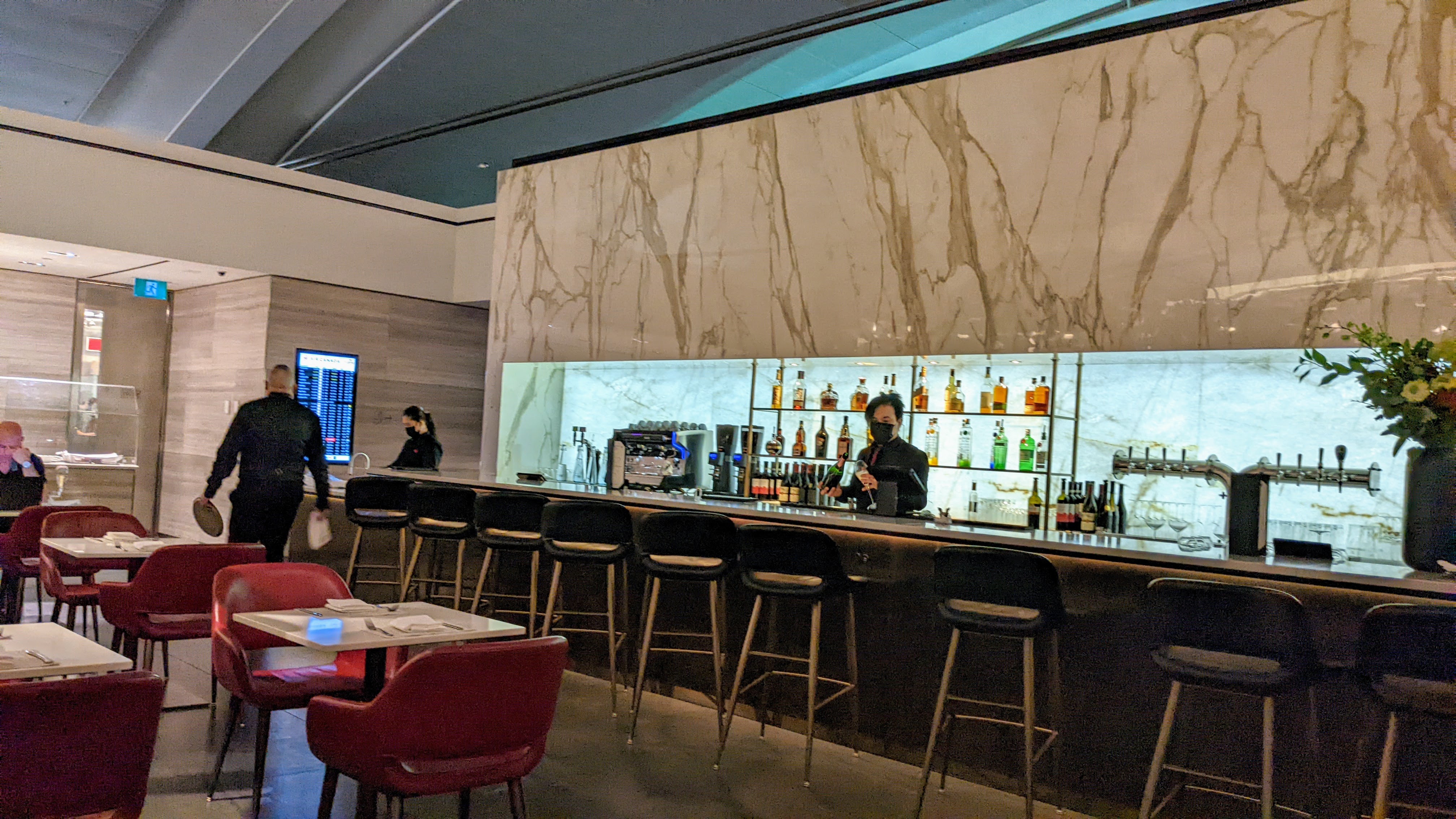 The Lounge offers a selection of a-la-carte meals developed by celebrity Chef David Hawksworth, full bar service, and a buffet. There is restaurant-style table seating, bar seating, and lounge seating with couches, chairs, and low tables. There is also a place to store luggage which is very convenient.
