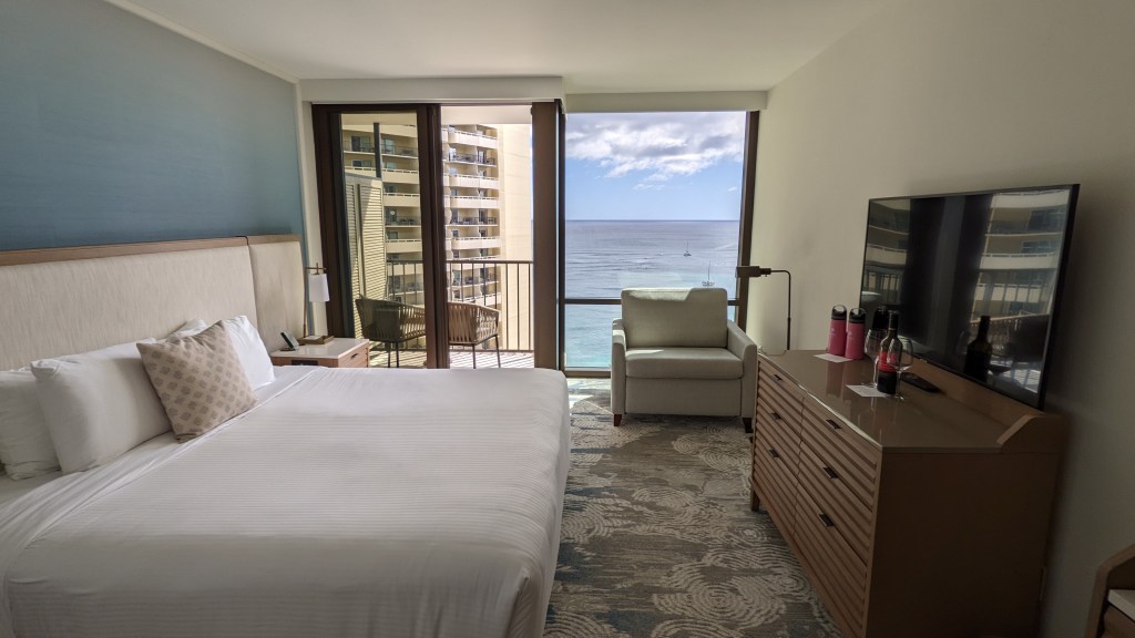 We chose the Halepuna as it appeared to offer everything we look for in our accommodations when travelling to Oahu. The ability to book a package that provided certain perks (in our case we chose an upgrade and late check-out) was also extremely valuable to us, especially when we are always faced with late departures from HNL when returning home. We booked a package that included 2 perks from a list and we chose a room upgrade from ocean view to deluxe ocean view and late checkout at 4 pm on our last day. The hotel also does not charge a resort fee: it is built into the nightly rate. They also offer small things, like coffee, juice, and a pastry in the morning in the lobby, water bottles to be refilled with filtered water from their dispenser (you get 2 bottles!).