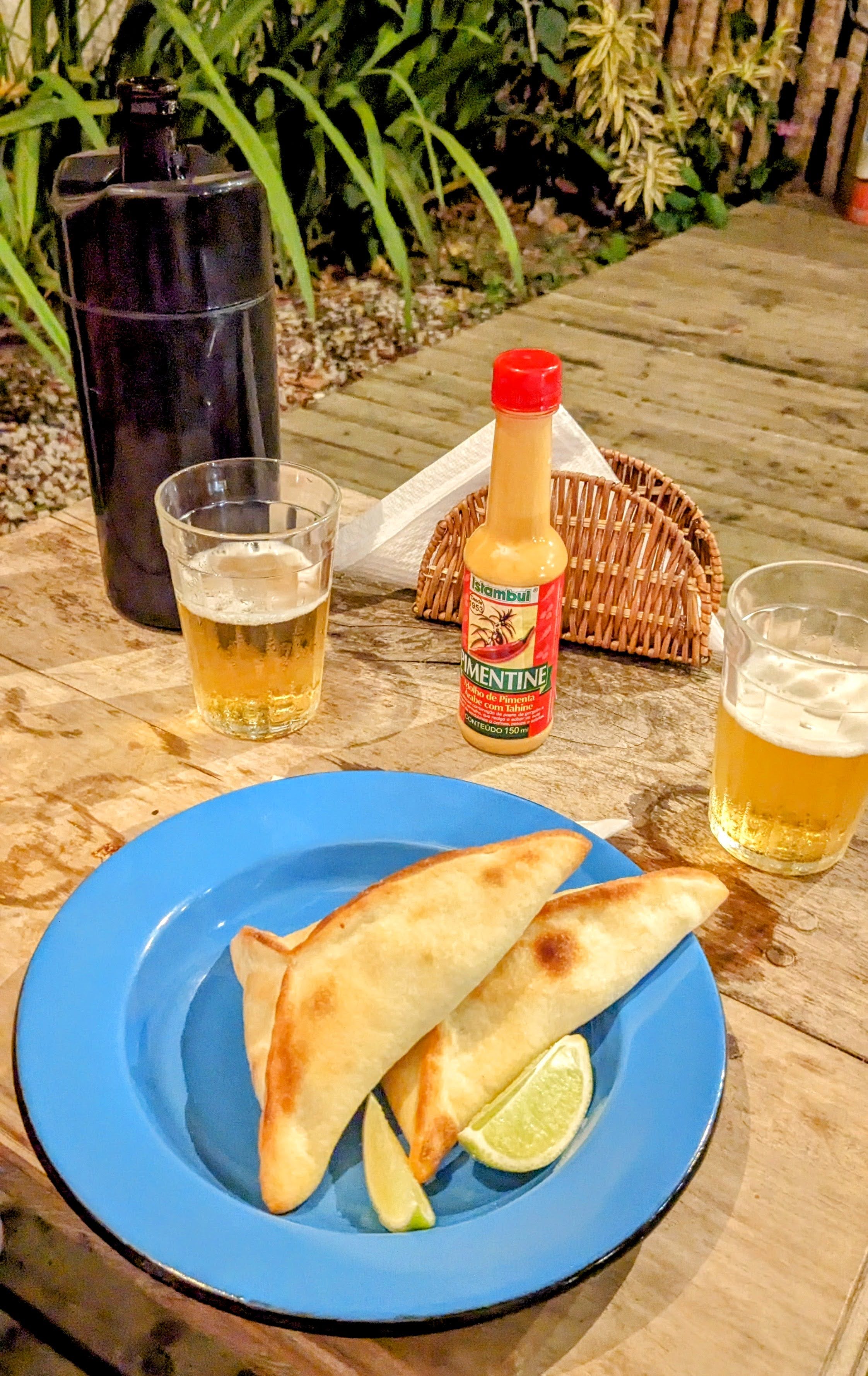 - Ca Cozinha: We stumbled upon Ca Conzinha while walking outside the Quadrado one evening. As we were not very hungry, we decided to give this a try. They serve “esfihas”, which are Brazilian meat pies. They have meat and vegetarian options. We enjoyed a couple of esfihas each, with a few cold beers. Since our visit, we have learned that Ca Conzinha has opened up a 2nd location in the Quadrado. They also do take out, if you want to grab some for the beach.