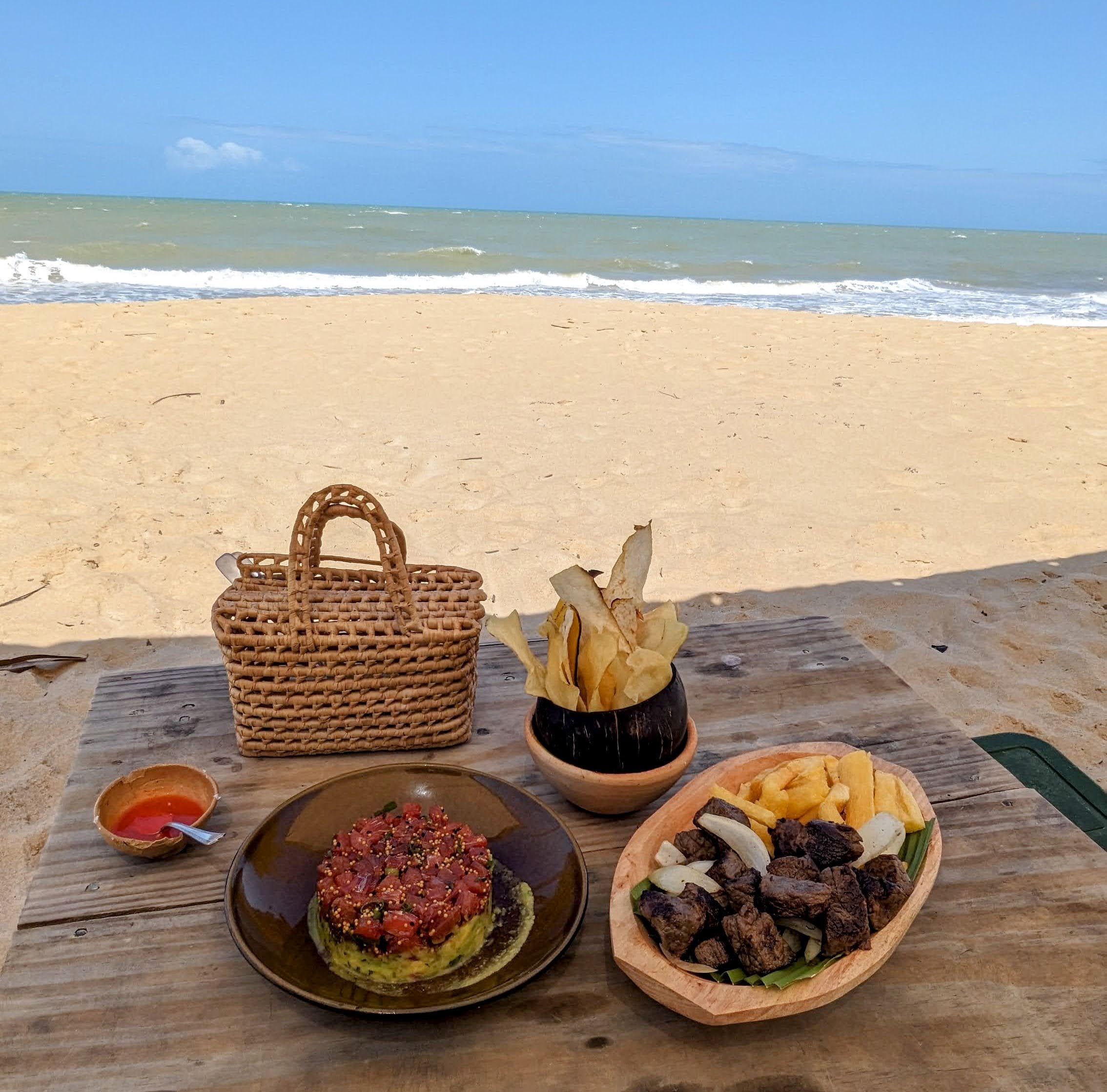 - Praia Tartarugas Beach Club: We took our hotel’s advice and booked a day here to enjoy the beach, food, and drinks. As we were more interested in the dishes on the beach menu, we stayed here instead of going up to the restaurant for lunch. They had all kinds of things, like fish moqueca, steaks, fish, etc. Overall, the food and service were impeccable and we are happy we came to relax here.