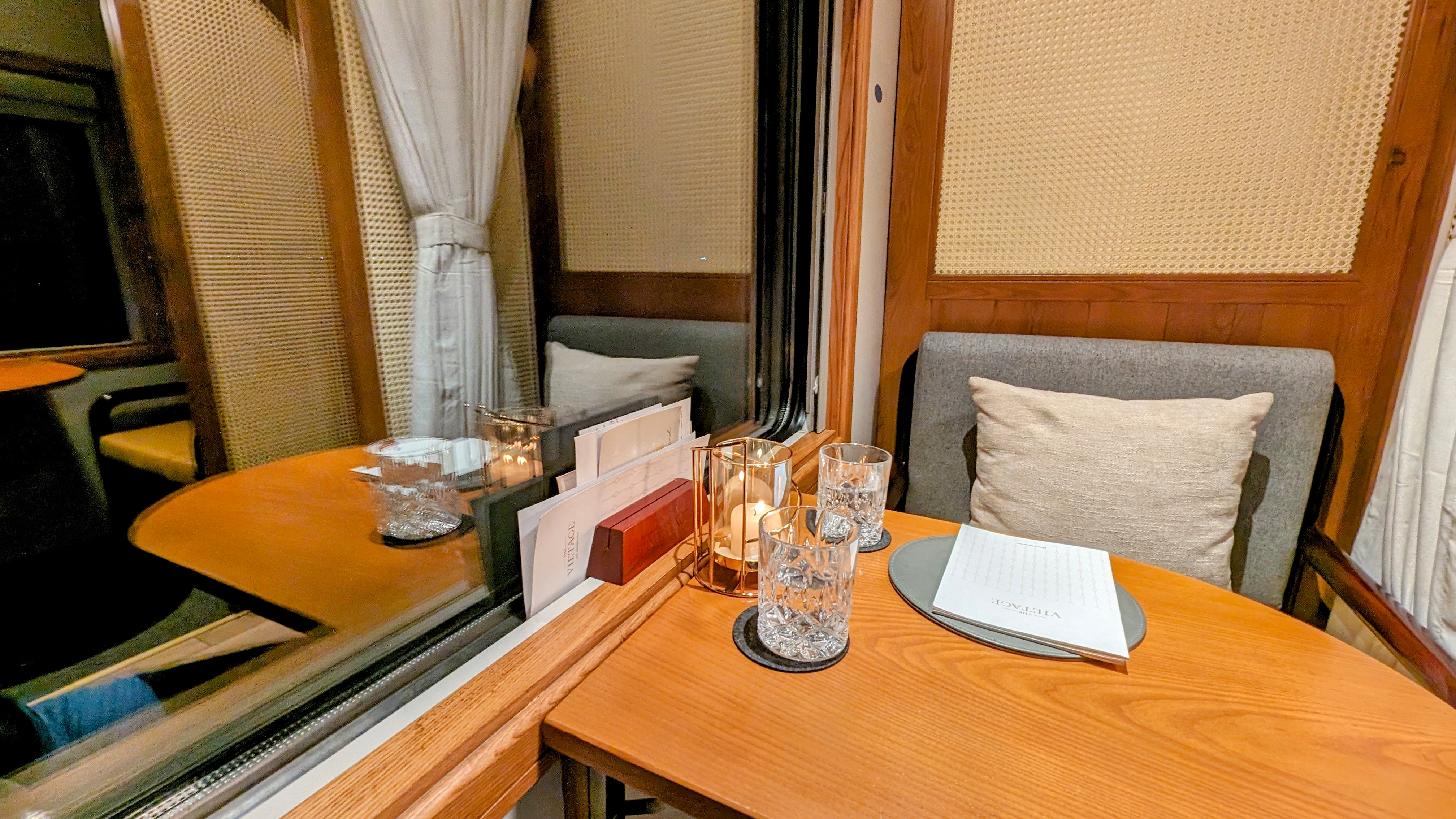 The train was a little late, which is common, but we were boarded and our way pretty quickly! Onboard, we were some of the only guests, and almost felt like we had the train to ourselves. As a result, we were able to use one of the vacant sleeper booths to rest. As we took our seats, we were offered welcome drinks and some ice cream to start.