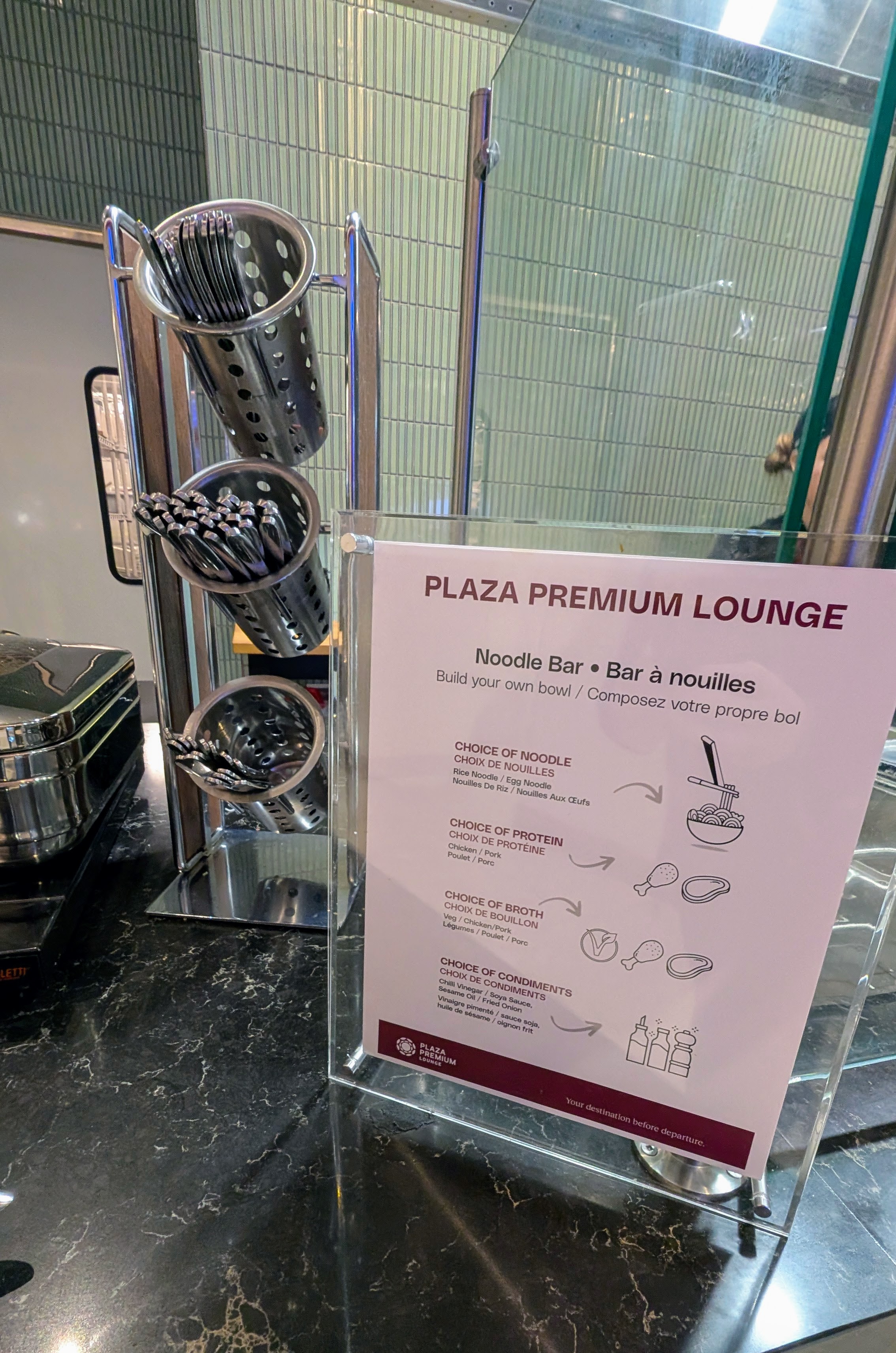 -Food offerings are average overall (with the exception of the noodle bar) The options were mostly the same as the YVR Plaza Premium Domestic or Transborder lounges