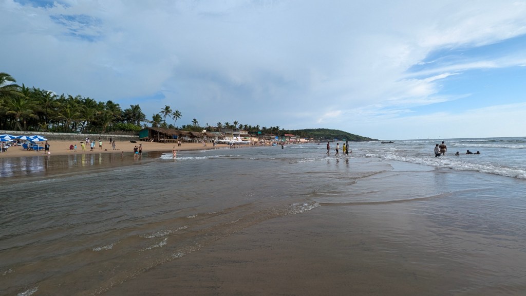 The beaches we visited had similar characteristics: long stretches of flat, golden sand with calm to choppy waves. Due to the choppier waves and some rain, the water was not clear in some spots because of the constant churn. We only ended up swimming at Vagator Beach, as the surf was calm and the water was very clear. This beach was within walking distance of the JW Marriott Goa where we were staying.