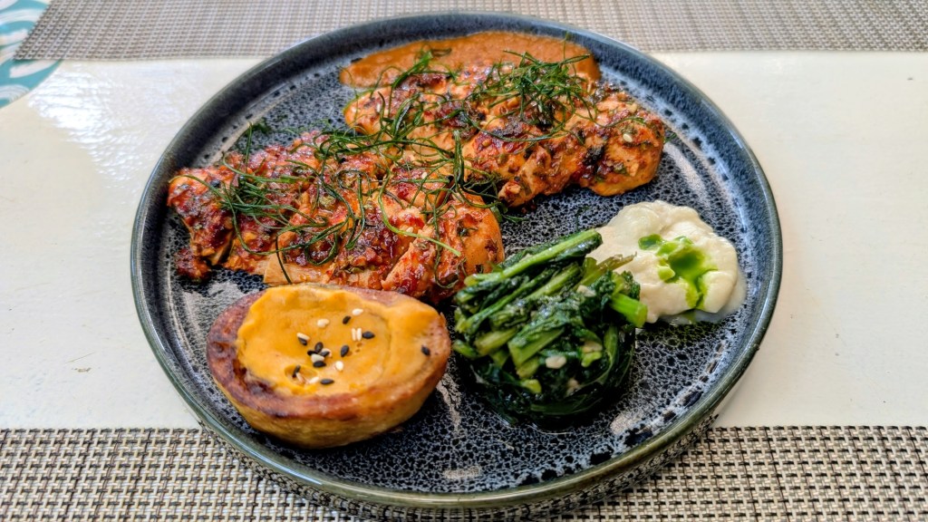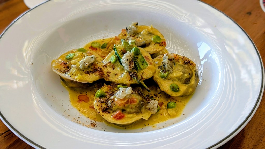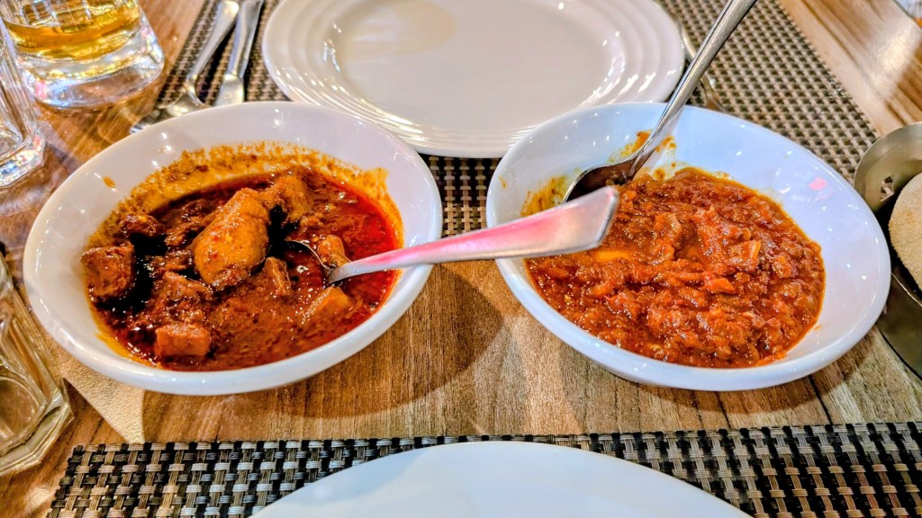 - Spicy seafood with recheado and sides. Recheado is a spicy masala in Goa made with chilies, garlic, ginger, spices like cumin, coriander, and peppercorns, and vinegar (if you are familiar with and like Indian vindaloo and Portuguese peri peri, this will be familiar to you). As there was a Fisherman’s Wharf located within walking distance to the St. Regis, we decided to have a meal here and enjoyed it very much. We had recheado prawns with peri peri fries, coleslaw, and a Portuguese bun. This meal combined things we liked from Indian and Portuguese food!