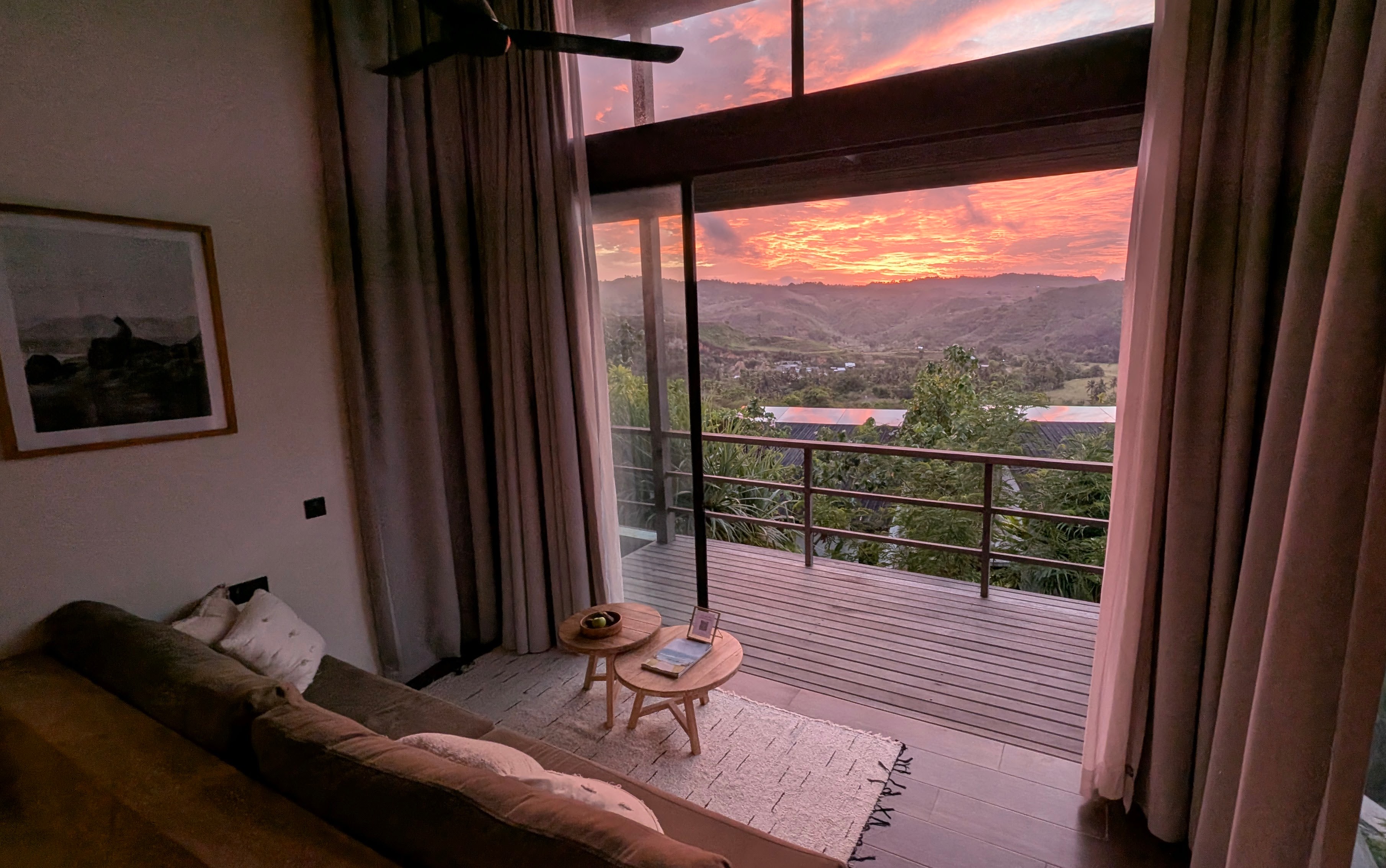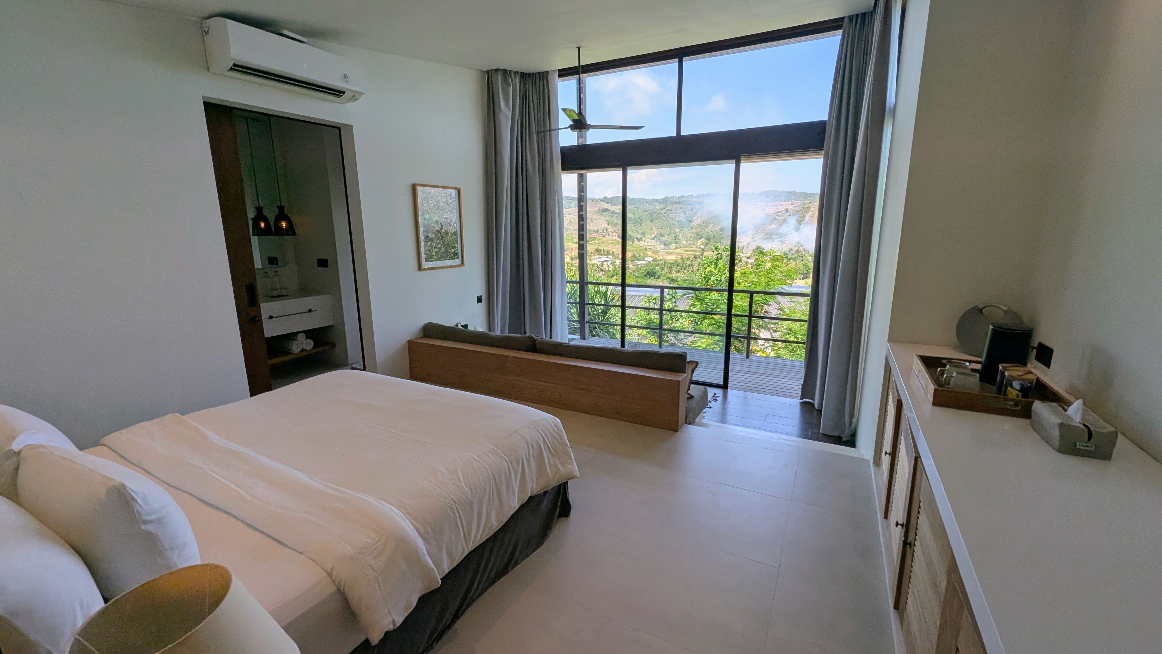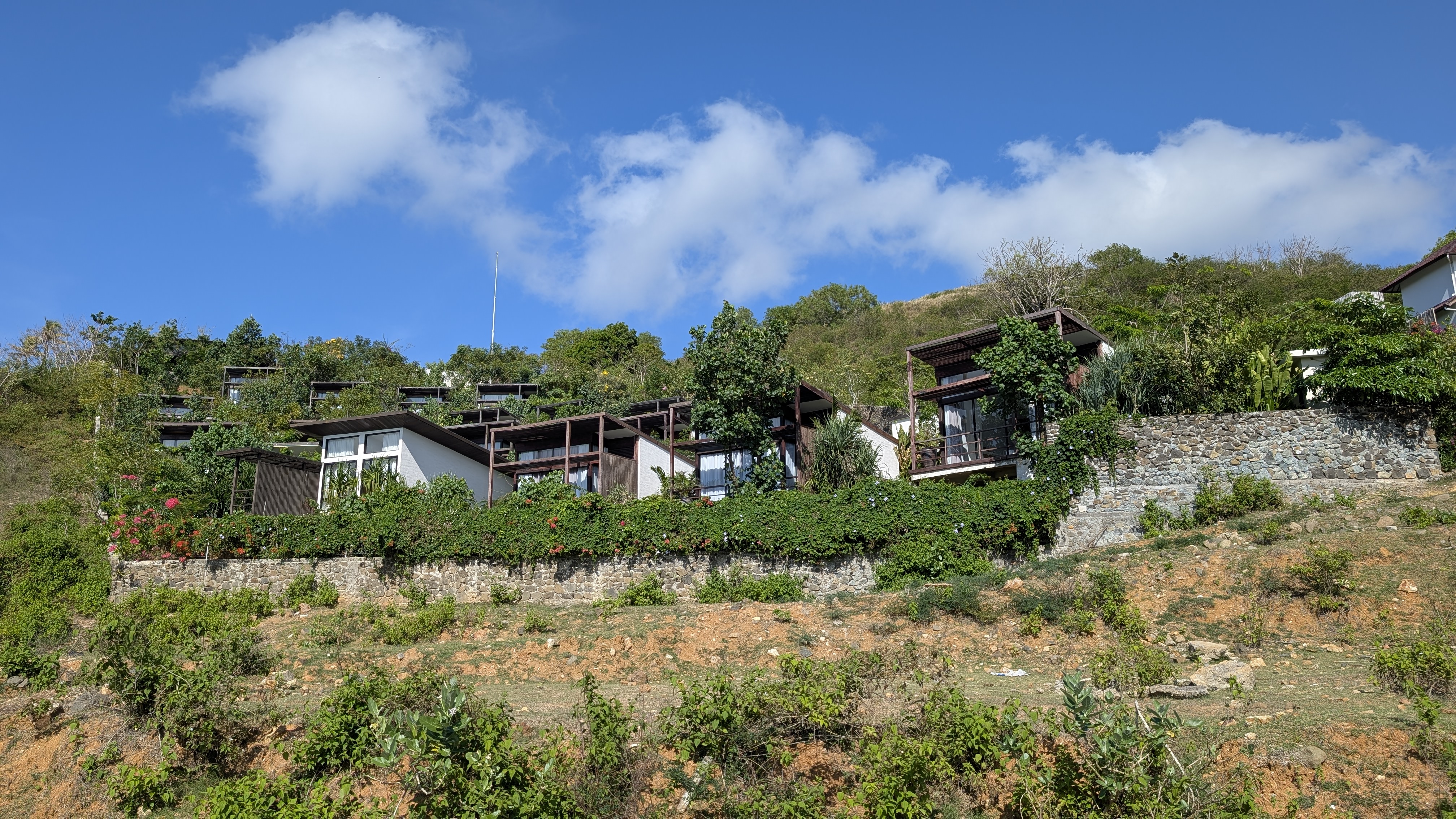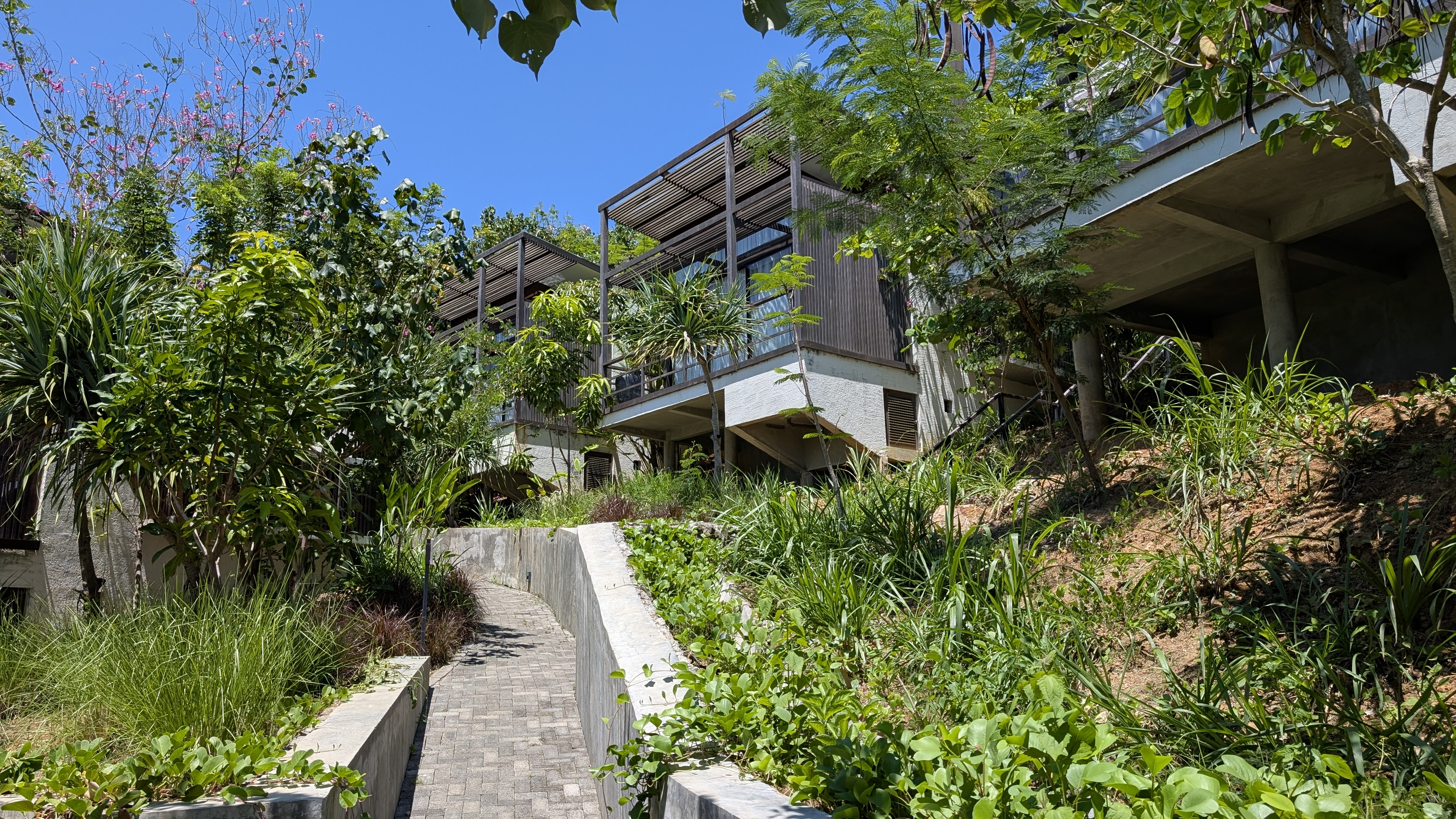 Hotel Design: 87 – Modern tropical on a steep hillside with lush landscaping. The villas face the valley and the common area with the reception, pool, and restaurant/bar are stunning with the view of the hills and ocean. There are many steep stairs to access rooms and those with mobility challenges will struggle here. We saw some guests using a scooter to get from their rooms to the reception area for meals and to use the pool.