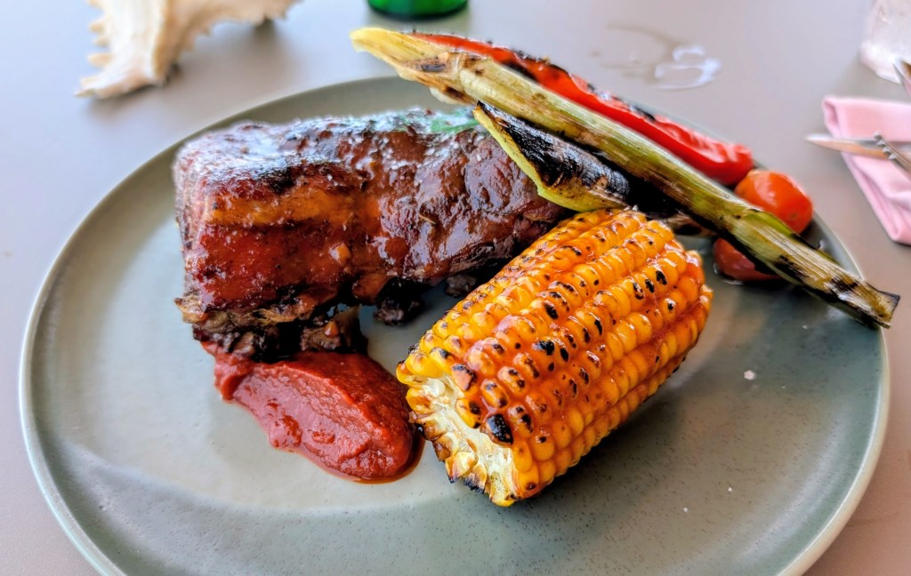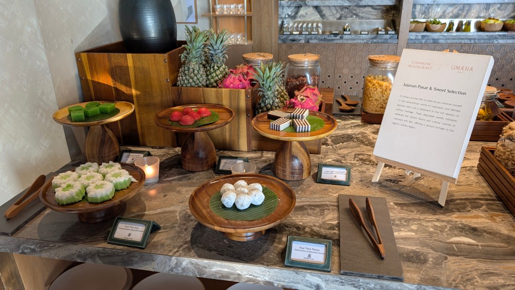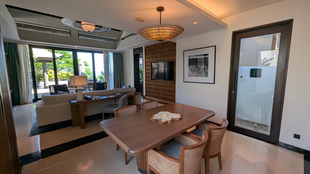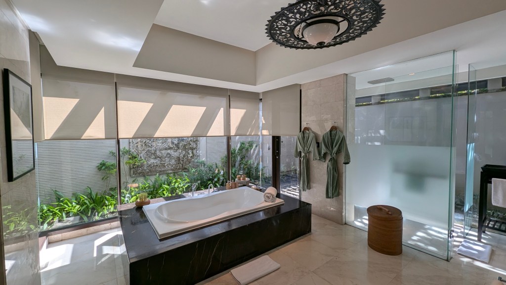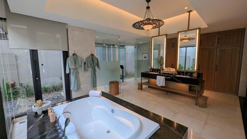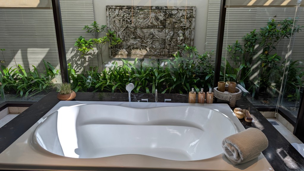 Hotel Amenities: 88 – A large pool, a gym, a spa, activities (for a fee), and a very nice beach club (accessible to outside customers as well). For dining, there is the beach club that has a variety of things (we really enjoyed the ribs and ceviches), the pool bar has drinks and snacks (we enjoyed the satays), Commune is the all day restaurant where you have breakfast every day, Oliverra is their Mediterranean fine dining restaurant, and they also have things like a private chef in villa service, room service, etc. We ended up going to the Indonesian food and dance event and really enjoyed it! You also have access to a butler during your stay that can help with dinner reservations and also open the welcome coconuts in your villa! The hotel offers a shuttle service to and from the beach club, but you can also walk by taking the stairs (you just need to notify the staff).