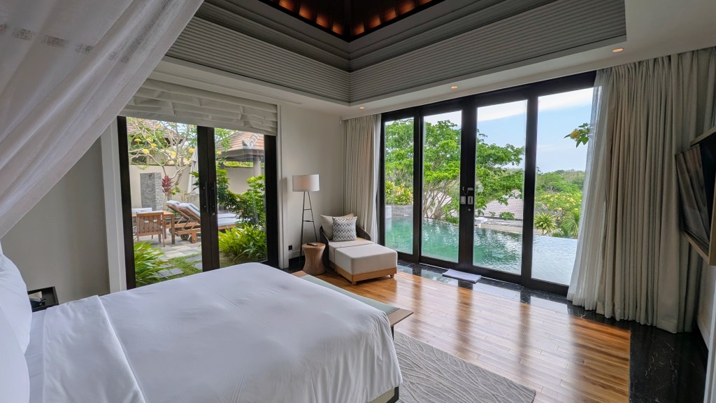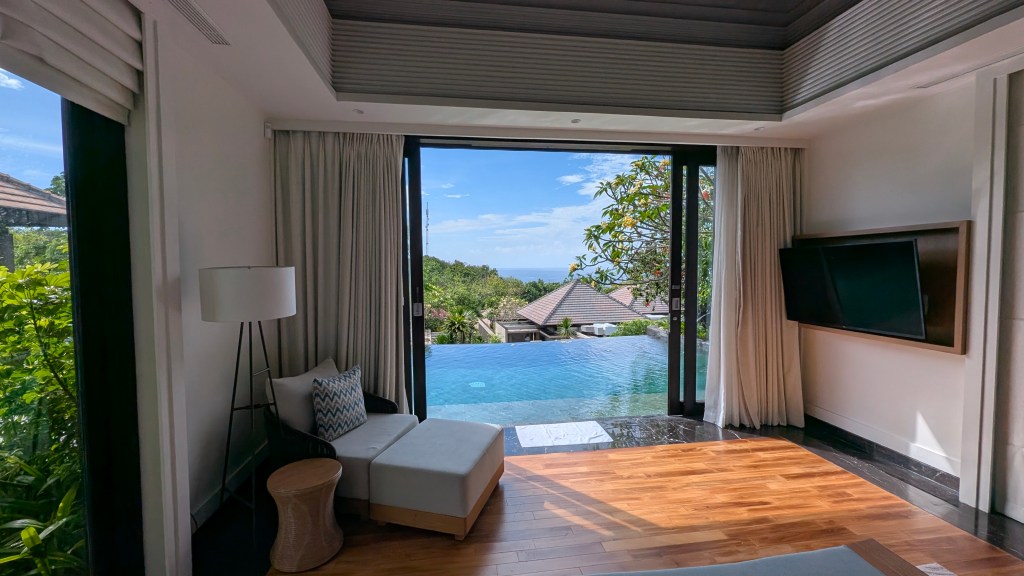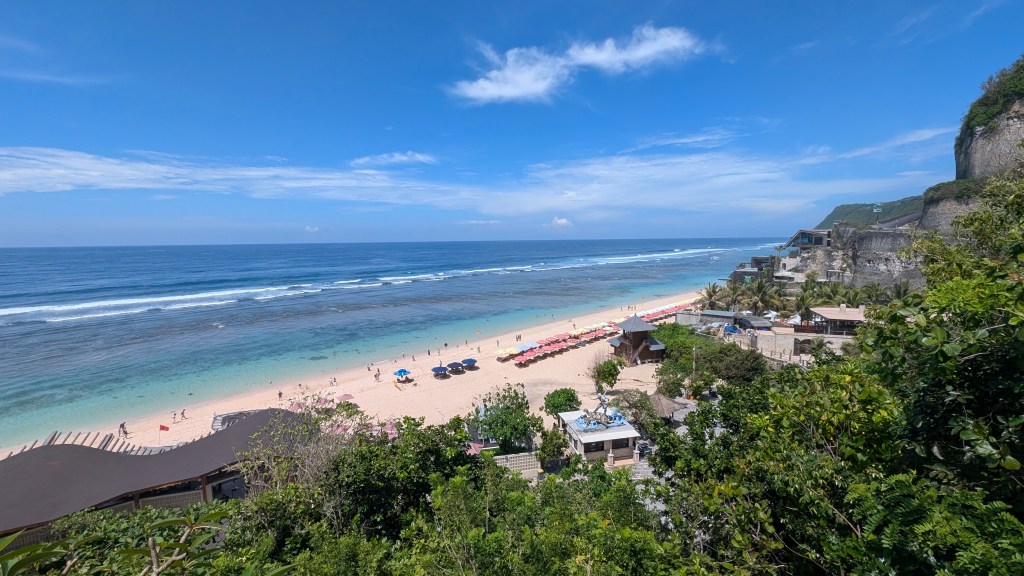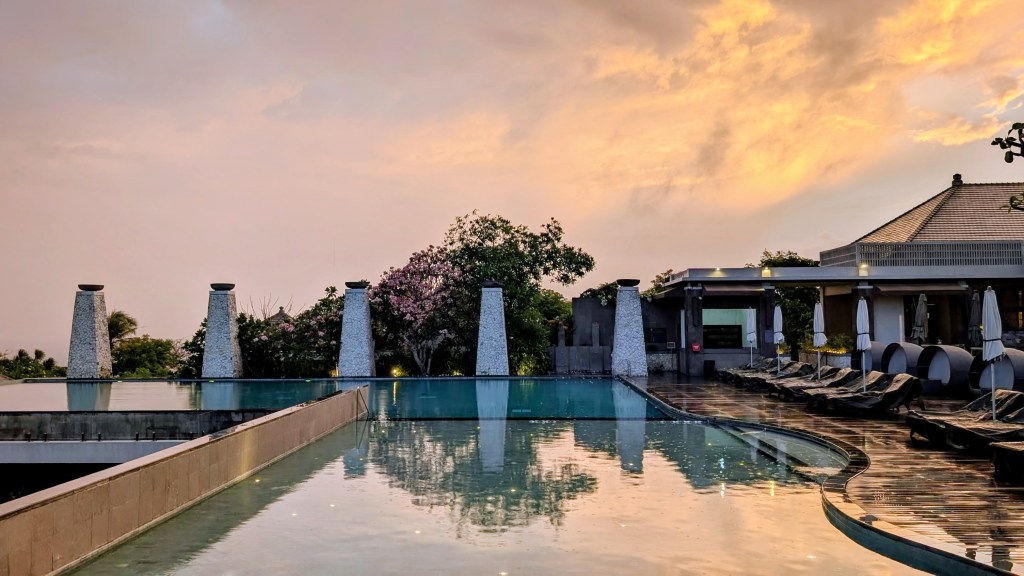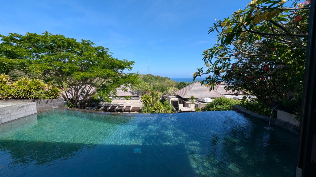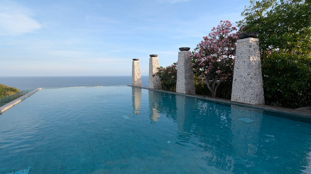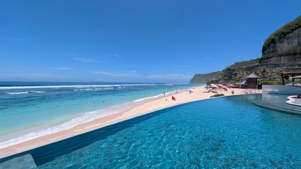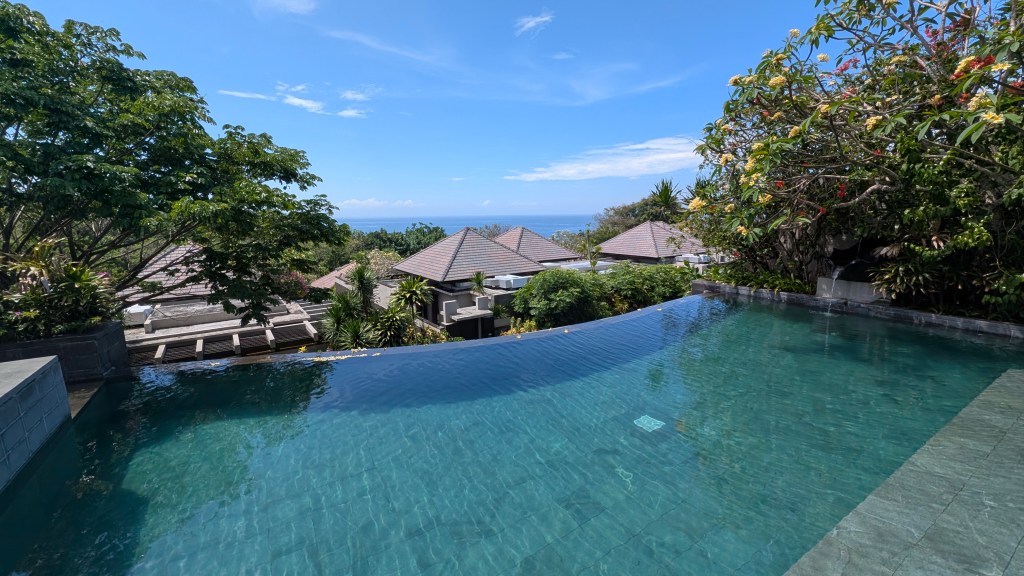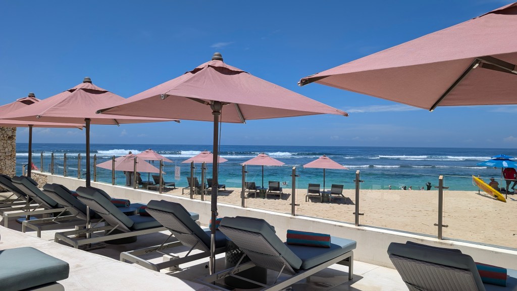 Location: 90 – On a cliff high above one of the most beautiful beaches we’ve seen in Bali, but a bit far from anything else. Unless you are using a scooter and trying to use Grab, you will be confined to the hotel and their beach club for your stay.